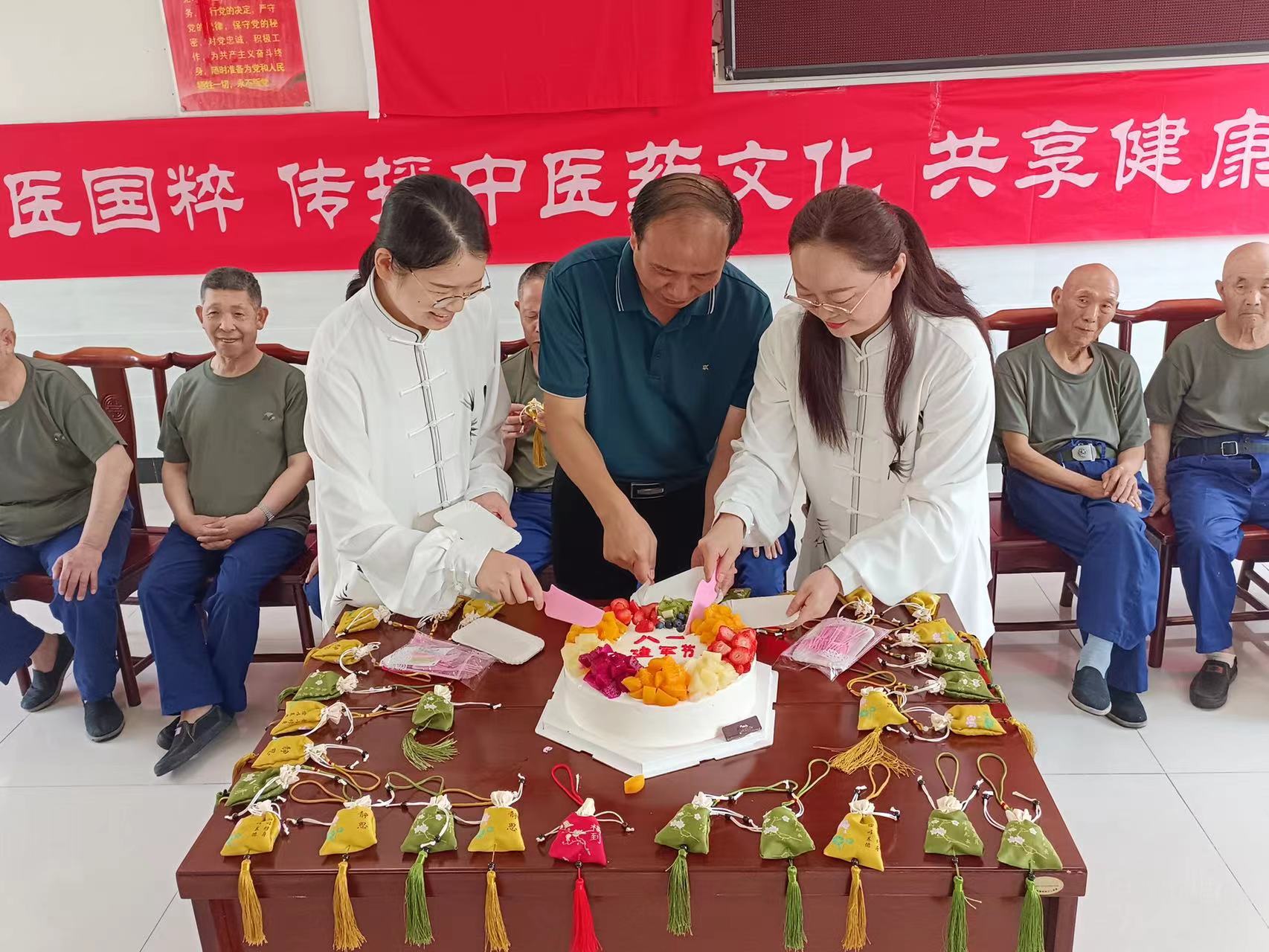 活动中,中医科医护人员为供养老兵们展示了八段锦这种非常古老的健身功法,并提供精美的节日蛋糕和亲手制作的防蚊虫香囊,以表达关心与感激之情。