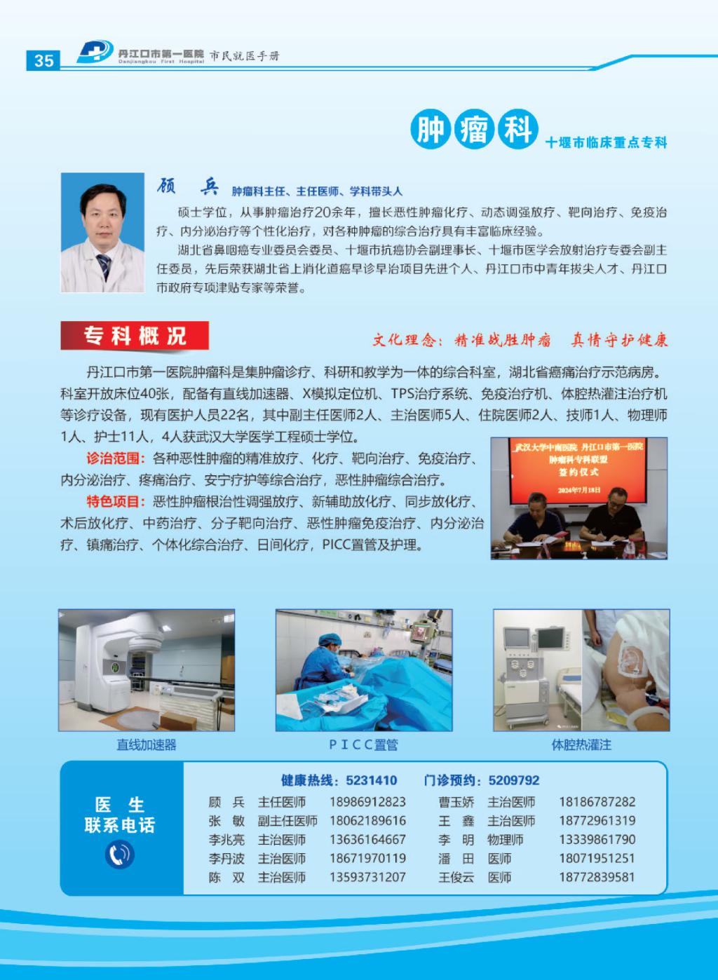 丹江口市第一医院肿瘤科是十堰市乃至鄂西北地区二级医院中最早成立并独立设置的集肿瘤放化疗于一体的综合性临床特色专科,同时是湖北省临床县级重点专科、十堰市临床重点专科、十堰市优质示范科室。科室开放床位50张,现有各级各类专业技术人员20名,其中副主任医师2名,主治医师2名,住院医师3名,专业放疗技师2名,专业护理人员11名,在职研究生4名。主要从事各种恶性肿瘤放、化疗及综合治疗。
